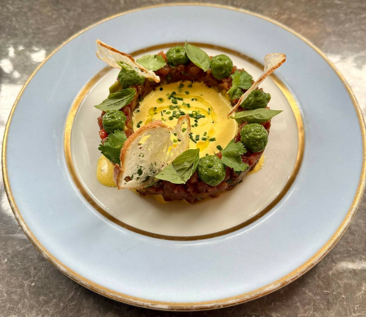 Охлажденный тунец, перец конфи, кинза, базилик, маринованный лук, соус Руй, соус гуакамоле, чипсы из багета